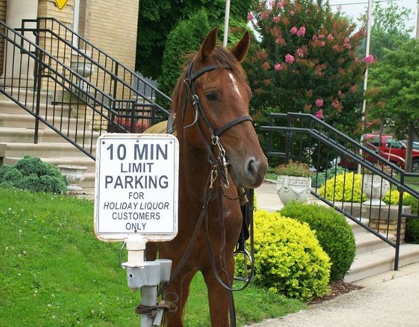 Sur cette image, un cheval attaché à un panneau de stationnement pour dix minutes, photo prise lors de la reconstitution de la bataille de Corydon, en 2009.