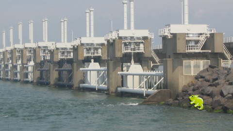 Notre aventurier s'appelle Léon Camay. Il participe à tout et à n'importe quoi, au gré de vos envois d'images. Et comme un vrai caméléon, il se fond dans son environnement. A vous de le retrouver dans cette photo où il découvre le barrage anti-tempête du plan Delta à Oosterscheldekering (Pays-Bas).