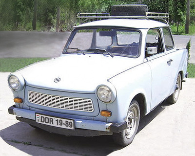 La Trabant, produite dans l’usine de Zwickau, prendra officiellement ce nom le 4 octobre 1957, ce jour-là les Soviétiques ont mis sur orbite le premier Spoutnik, “satellite”, en russe, Trabant a le même sens en allemand. Mais c'est le 7 novembre 1957, jour anniversaire de la révolution de 1917, que le premier véhicule sort des chaînes. Facile à entretenir, elle était équipée d’un moteur à deux temps et pourvue d'une carrosserie en «duroplast», une matière à base de fibres de coton et de résine. "La voiture que rien n’arrête…même pas ses freins" comme la décrivait une de ces nombreuses plaisanteries qui égaillaient un peu la grisaille communiste, n’avait guère évolué au fil des ans. Quelques modèles cependant étaient pourvus de moteurs à quatre temps. Sa production fut arrêtée en avril 1991. La dernière Trabant sortie était de couleur rose et portait le numéro de production 3 069 099.
