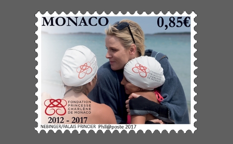 Pour célébrer les 5 ans de la Fondation Princesse Charlène, l’Office des Timbres de Monaco vient de mettre en vente deux timbres, d'une valeur faciale de 0,71€ "South Africa Monaco Rugby Exchange" et de 0,85€ "Prévention de la noyade" dont la photo a été prise en Corse.