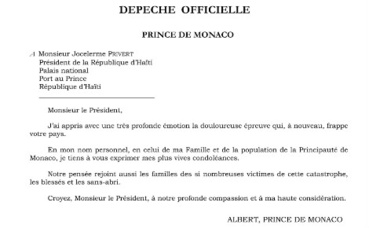 Suite aux dégâts causés par l'ouragan Matthew lors de son récent passage sur l'île, S.A.S. le Prince Albert II a adressé un message de soutien aux sinistrés de Haïti.