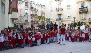 Les élèves de l'école de La Condamine chantant l'Hymne national pendant le lever de drapeau. Photo (c) Centre de Presse de Monaco / Charly Gallo.