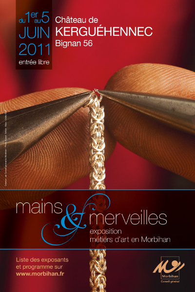 Après le succès de l'édition 2009 au Château de Kerguéhennec (plus de 16 000 visiteurs français et étrangers en 5 jours) et d'une formule itinérante l'été dernier au sein même des ateliers d'art du Morbihan, l'exposition vivante "Mains & Merveilles" investit à nouveau le Domaine de Kerguéhennec situé à 30 kilomètres au nord de Vannes. Une formidable occasion pour les amateurs, passionnés, touristes et nombreux chineurs de rencontrer une quarantaine des 660 professionnels des métiers d'art du Morbihan aux savoir-faire uniques. Bijoutiers, verriers, ébénistes, vitraillistes, sculpteurs, peintres, graveurs, couteliers, potiers, forgerons... transmettront leurs passions à travers démonstrations (taille de la pierre, sculpture sur bois, forge coutelière, poterie et cuisson raku, lithographie, gravure...) et animations pour "petits et grands".