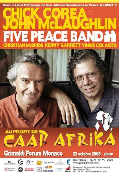 Pour la première fois depuis leur union sacrée autour du légendaire groupe de Miles Davis, il y a 40 ans, les deux musiciens rassemblent leurs propres forces, accompagnés par trois des plus célèbres musiciens contemporains : Kenny Garrett (Sax Alto), Christian McBride (Basse) et Vinnie Colaiuta (Batterie). Leur nouveau groupe, FIVE PEACE BAND, va faire de nouveau mettre le monde de la musique en ébullition… Pour bien démarrer leur tournée mondiale, « Five Peace Band » a décidé de faire une première prestation en Principauté de Monaco le 22 octobre. Ce sera sur la scène du Grimaldi Forum, un concert donné à but caritatif au bénéfice de l’association humanitaire « Caap Afrika ».