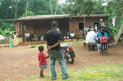 10h 05 mn, départ de la présidente du CECULTRA, madame MENGUE Marie pour Nkolnsoh. Retardé quelques instants après par des bouchons dans les différentes artères de la ville capitale elle arrivera finalement à Nkolnsoh à 11h 45 mn, malgré la longue attente, la foule émerveillée accueille joyeusement son hôte de marque au rythme frénétique des tam-tams des Seigneurs de la forêt à la chefferie du Groupement Mvog-Amoug III. Madame MENGUE Marie, commencera d’entrée de jeu son discours par un mot d’excuse pour le retard et durant 15 minutes illustrera les activités de son Centre, stimulera la population au développement participatif, à la réappropriation et réactualisation de la tradition orale, des jeux traditionnels, l’art culinaire et remerciera enfin le public pour cet accueil chaleureux.
