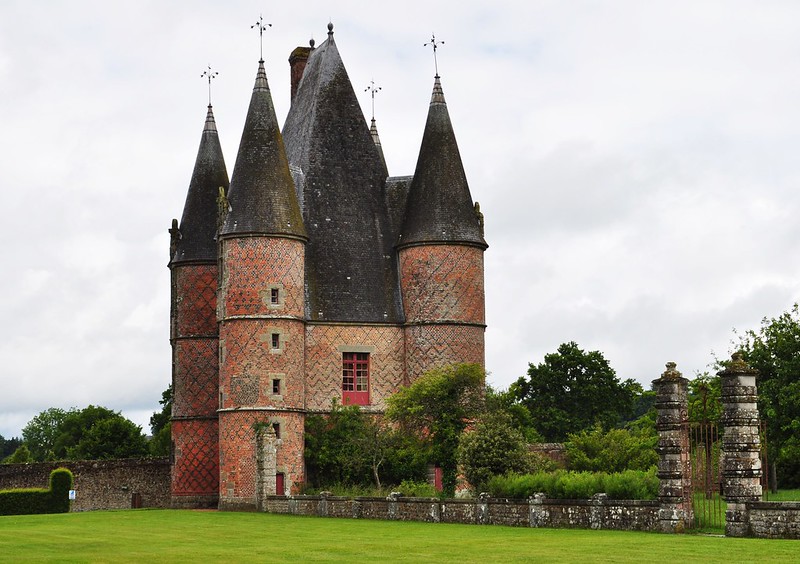 Construit, au départ, sur un marécage, le château de Carrouges n'a pas connu les affres de la guerre mais a pu s'enorgueillir d'accueillir le roi Louis XI en 1473 et Catherine de Médicis en 1570. La spécificité de l'édifice réside dans l'utilisation de la brique, abondante dans la région du fait de la présence importante d'argile. Cela donne une construction qui hésite entre la forteresse médiévale et le château Renaissance, le tout dans des tons noir et rose des plus surprenants.