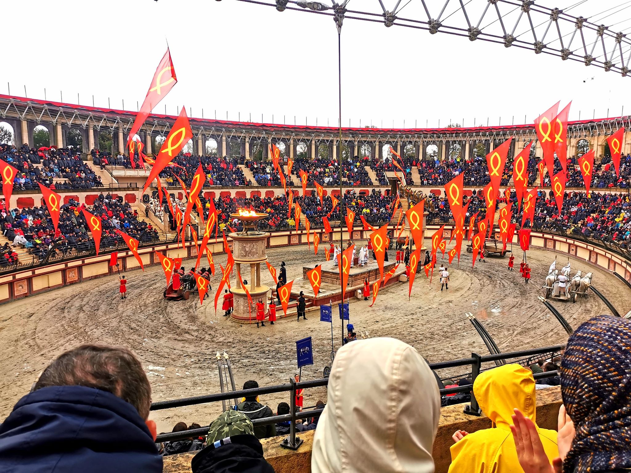 Une fin de saison sous les imperméables au Puy du Fou, ici lors du spectacle Le Signe du Triomphe (c) Emily Brothier