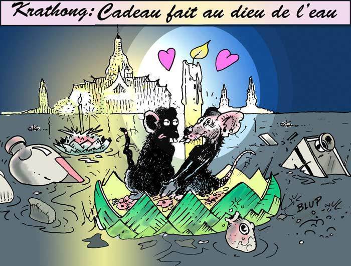 Le soir de la pleine lune du douzième mois du calendrier thaï lunaire traditionnel (généralement en novembre du calendrier occidental) est l'occasion d'un rassemblement près des eaux de rivière, de fleuve ou de mer, pour y faire flotter des krathongs, vaisseaux ornés de fleurs et éclairés de bougies. Cette année les rats se sont invités à la fête.