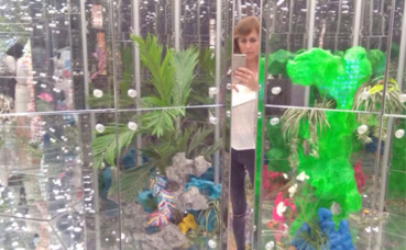 On pense inévitablement au célèbre livre de Lewis Caroll "Alice au Pays des Merveilles" dans lequel les choses, les êtres, l’environnement tout entier viennent à se métamorphoser. Dans l’installation de Deng Guoyuan, le temps ralentit, le tourbillon joyeux généré par les miroirs se transforme en un labyrinthe, l’œil se pose sur les détails et commence à les disséquer. La plante de "Taihu" est récurrente dans la peinture et calligraphie traditionnelle chinoise; si on en devine la forme si particulière, on ne peut que remarquer l’étrange peinture qui la recouvre, comme la plupart des éléments dits "naturels". Les plantes, insectes et pierres sont ici réalisés en résine, à la différence du premier "Noah’s garden" où tout était "réel", et sont recouverts de peinture à carrosserie de voiture (un des éléments polluants de l’époque).