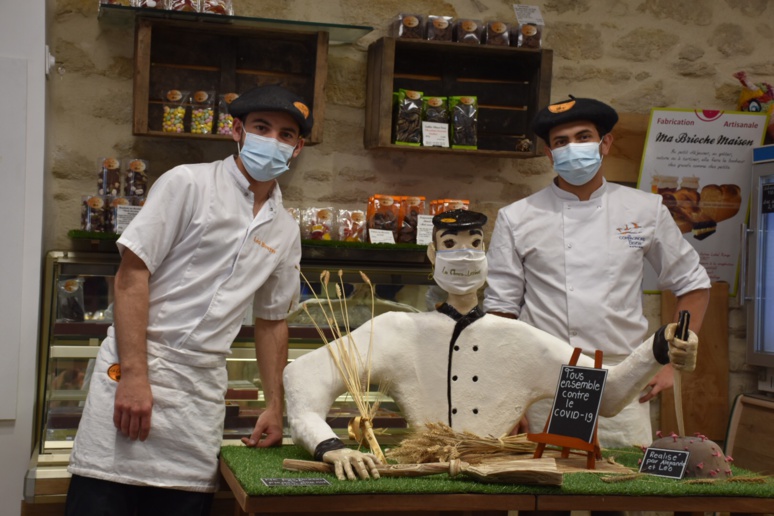 A la guerre, comme à la guerre, lorsque le confinement a commencé, à la Choco-Latine on a tout de suite mis en place des mesures de distanciation : marquage au sol de la file d'attente, mais aussi sacs de farine disposés le long du comptoir pour empêcher les clients de s'approcher trop près des vitrines et de postillonner dessus. "C'est vrai que ça rappelle la guerre ! Les sacs de farine, ça fait penser aux sacs de sable qu'on entassait pour se protéger des tirs, là c'est pour se protéger de la contamination" explique le boulanger, qui d'emblée a pris la situation en main. Puis sont arrivés protections de vitrines en plexiglas, gants, masques et gel hydro alcoolique. La petite boutique est certes méconnaissable mais ces mesures permettent de lutter contre la contagion et sécurisent les clients comme les employés. Une idée qu'ont matérialisé deux d'entre eux. Léo et Alexandre ont ainsi réalisé un boulanger masqué en pâte à pain avec pour message : "ensemble luttons contre le coronavirus" .