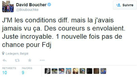 Habitués à la pluie, la neige et la grêle (certaines années), les cyclistes professionnels se battent également dans le vent. Mais lorsque les conditions atmosphériques allient plusieurs de ces éléments, tout en privilégiant les rafales de vent (de 90 à 100 km/h), cela n'a plus rien à voir avec le sport, mais bien avec l'extrême. Sur les routes flandriennes, entre Deinze (Gand) et Wevelgem en passant par le Nord de la France et le Mont Cassel, bon nombre de coureurs n'avaient pas que des fourmis dans les jambes. En fait, ils devaient tout tenter pour rester sur leurs machines, et ce ne fut pas simple. La vidéo (ci-dessous) de nos confrères de Sporza, montre à quel point -que l'on soit "vedette" ou simple "porteur de bidons"- cet exercice devenait compliqué, même pour des professionnels. Si les commentaires sont en néerlandais, les images parlent d'elles-mêmes. Chapeau à ces forçats de la route, et on signalera qu'aucun "accident" majeur n'est à enregistrer.