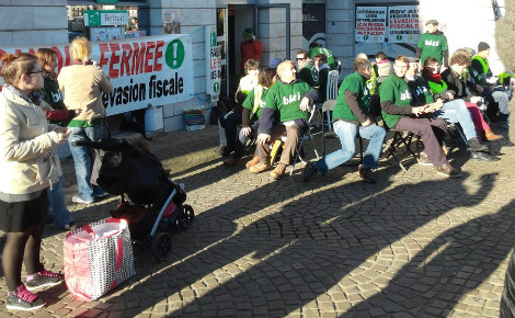 Militants Bizi à Bayonne le samedi 10 décembre 2016 pour une action "chaises musicales" et dénoncer l'évasion fiscale. Photo (c) Julie Cartelier