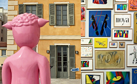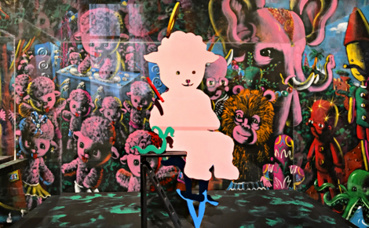 En guise de bienvenue dans le "Moya Land", l'univers créé par Patrick Moya, Dolly, moitié homme, moitié brebis de couleur rose, emblème de son bestiaire, accueille le visiteur sur l'esplanade de la galerie en tirant la langue facétieusement.