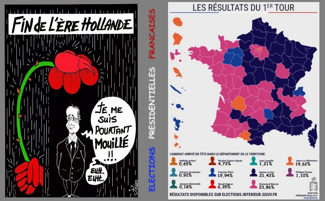 La France s'est divisée en quatre sur un score très serré le 23 avril 2017, laissant en compétition Emmanuel Macron et Marine Le Pen pour le second tour des présidentielles, le 7 mai 2017.