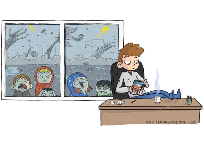 Né en 1988, Guillaume a fait comme la plupart des enfants lorsqu’il était petit: il s’est armé de feuilles blanches et de crayons pour faire "des beaux dessins". Mais en grandissant, alors que certains délaissaient leurs papiers, pastels et feutres, il a continué et n’a même plus jamais arrêté. A 12 ans, il a commencé à dessiner des BD sur Windows 95 et ce goût pour le 9e art lui est resté. Ayant suivi sa famille lors de plusieurs déménagements, il a vécu à Orléans, Bordeaux, mais aussi à Lyon et Lorient (entre autres) pour faire ses études de professeur des écoles, avant de poser ses valises (mais pour combien de temps?) dans le Var, à Toulon. Adepte de théâtre, de sport, et notamment de natation, mais aussi de voyages (où il ne manque pas d’emmener son carnet à dessins), Guillaume est un touche-à-tout!