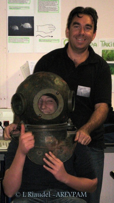 Une nouvelle fois des collégiens de Hyères et de Carqueiranne ont pu se familiariser à l'archéologie sous-marine organisée par le club associatif AREVPAM, spécialisé dans ce domaine. Une première séance a permis d'aborder l'histoire de la plongée professionnelle, conclue par l'essai de casque pied-lourd, pour le plus grand bonheur des élèves... et des profs!