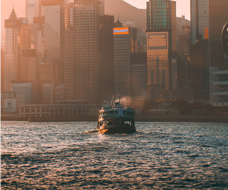 Lever de soleil sur la Baie de Hong Kong. Le terrain escarpé de la péninsule oblige 90% de la population à se concentrer sur 15% du terrain, favorisant ainsi la construction de gratte-ciels parmi les plus hauts de la planètre. / (c) Unsplash