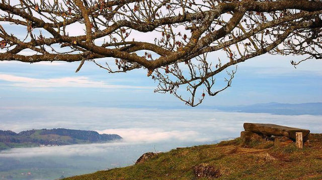 Panorama de la région du lac de Zoug depuis le flanc du Rigi en Suisse centrale.