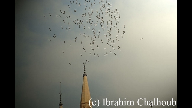 Des oiseaux migrateurs volent au dessus d’une mosquée à Tripoli au Liban.