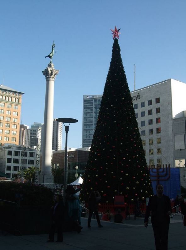 Arbre de Noël à l'Union Square de San Francisco, un des grands sapins des villes du monde. Parmi les nombreuses coutumes concernant l'arbre de Noël, notons que le sapin ne doit pas être érigé avant le réveillon, c'est-à-dire le 24 décembre, et doit être enlevé précisément douze nuits après, pour l'Épiphanie.