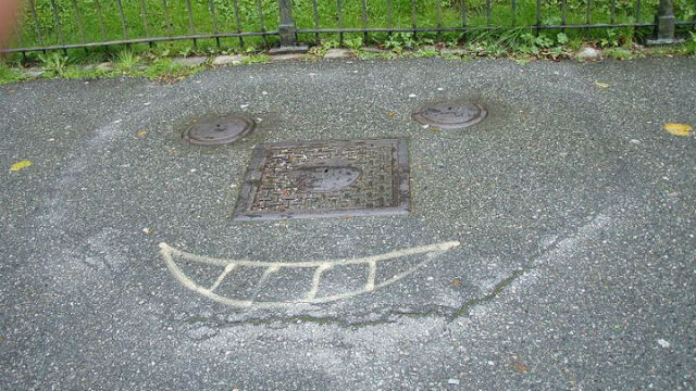 Les déformations d'un trottoir, complétées par un tag humoristique.