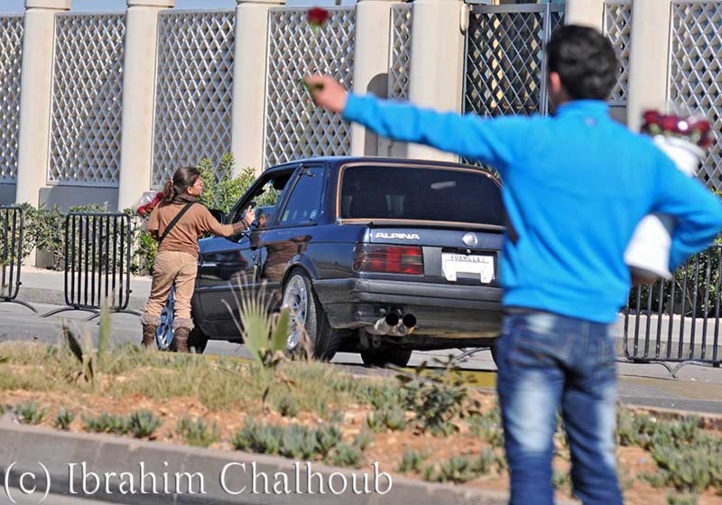 Une petite fille essaie de convaincre un chauffeur d’acheter une de ses roses pendant qu’un autre vendeur cherche ses clients sur l’autre côté de la route.
