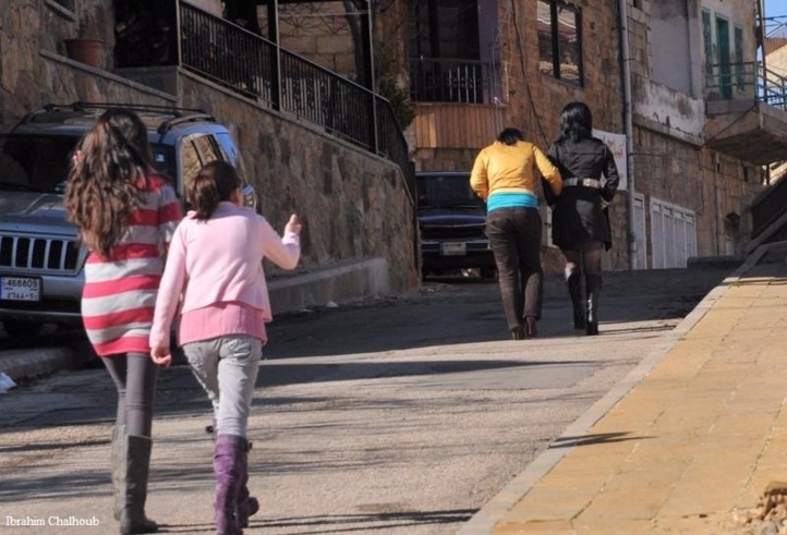 Une adolescente montre à son amie une adulte qui porte une courte jupe en hiver.