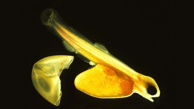 On peut voir les artères qui entourent le sac vitellin, des gouttelettes de graisse, ainsi que les intestins, la colonne vertébrale, les principaux vaisseaux sanguins, la vessie et les arcs branchiaux.