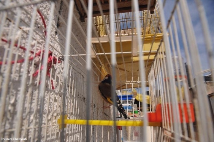 Des cages d’oiseaux placées sur un mur leur permettent de rester en contact visuel avec le ciel.