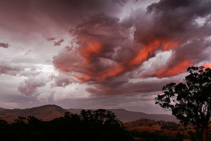 Réflexion sanguines du soleil sous les nuages, au crépuscule.