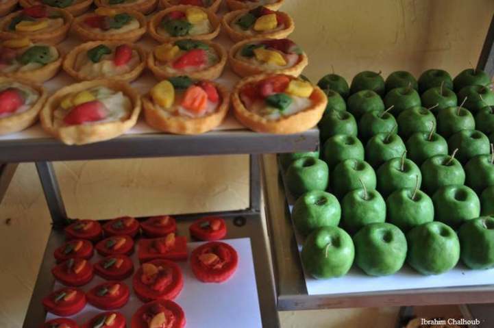 Des pommes et des tartes en cire. Un décor qui peut être allumé!