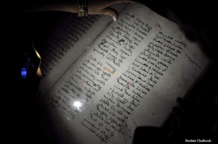 Écrit syriaque dans une pièce sombre. Les visiteurs ont utilisé la lumière d’un téléphone portable pour prendre une photo d’une page de l’Histoire!
