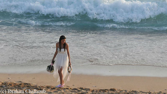Une jeune mariée pose au bord de la mer pour une séance de photographie.