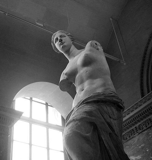 Détail du buste du Vénus de Milo, mettant en évidence la différence de surface des deux sections de bras dont le gauche a une surface régulière et le droite présente cassure et mortaise.