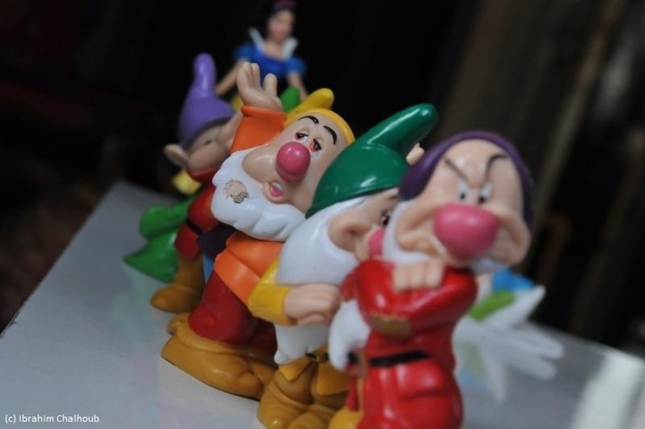 Des jouets de Blanche Neige et les sept nains, placés sur une table durant un jeu d’enfants.