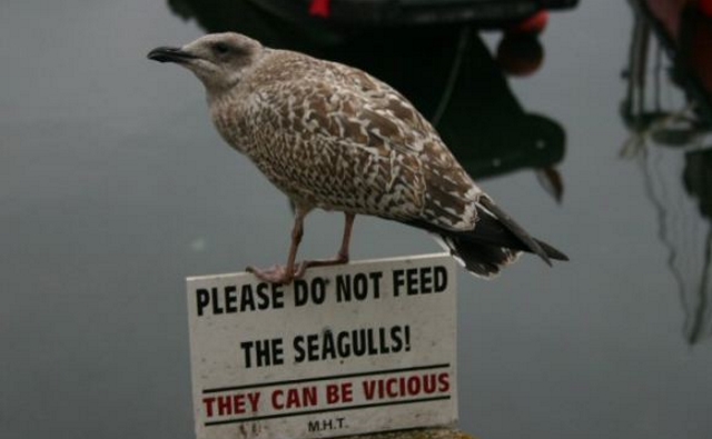 Ce jeune spécimen a le sens de l'humour... Il a été photographié avec le panneau indiquant: "Ne pas nourrir les mouettes! Elles peuvent être vicieuses".
