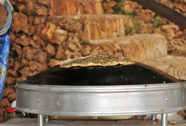 Traditionnellement, le saj (qui se prononce comme le mot sage avec un "s" lourd; écoutez le podcast audio pour l'entendre dans une phrase) est chauffé par la combustion de pièces de bois en dessous ce qui produit une man’ouché très bien cuite, mince et légère. La variante de nos jours est un saj à gaz qui se réchauffe plus vite.