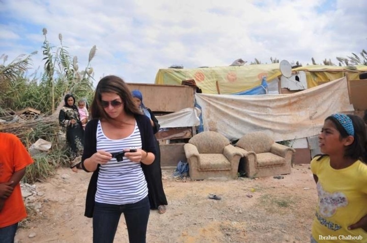 Une journaliste vient de sortir d’une maison de fortune, créée pour abriter les réfugiés syriens qu'on voit autour d’elle. A l'extérieur, c’est le salon-séjour commun parfaitement ensoleillé!
