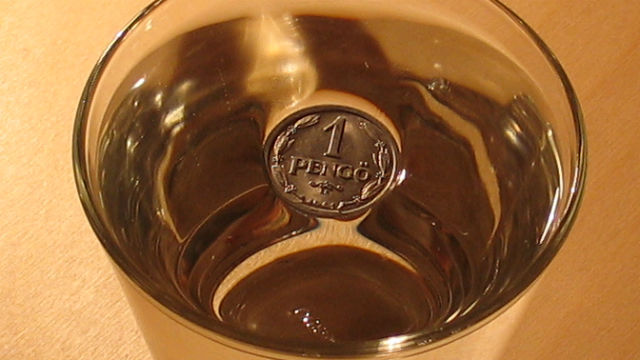 Une ancienne pièce de monnaie hongroise (1 pengő) flottant sur l’eau, grâce à la tension de surface.