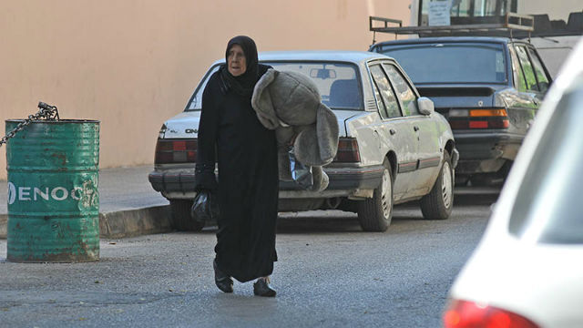 Une vielle dame traverse la rue en portant un animal en peluche.
