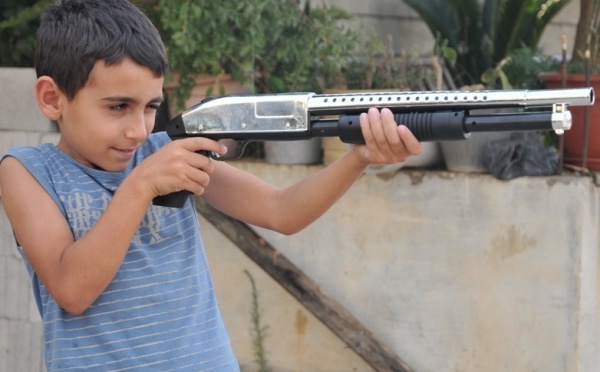 L'école de la violence: un garçon de huit ans avec son jouet préféré. Tenant son fusil en plastic, ce petit garçon joue à tirer dans l’air ou sur des...