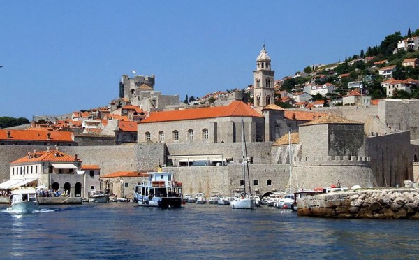 Le port et la vieille ville avec l'église de Dubrovnik, en Dalmatie (Croatie). Située au sud de la côte dalmate, à proximité de la frontière avec la...