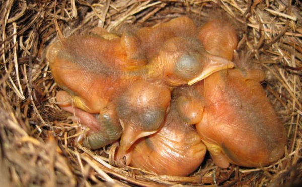 Poussins de Merle noir (Turdus merula) âgés de deux jours. Le Merle noir est une espèce de passereau de la famille des turdidés qui niche en Europe,...