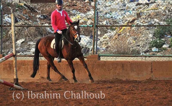Un jeune homme s’entraine avec son cheval sur un terrain d’équitation.