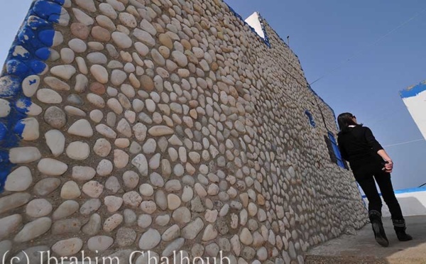 Un chalet maritime possède des murs dans lesquels des pierres furent enfoncées.