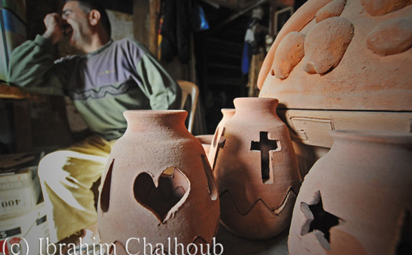 Des cœurs, des croix et des étoiles ont été découpés sur des petites jarres en argile qui servent de porte-bougie.