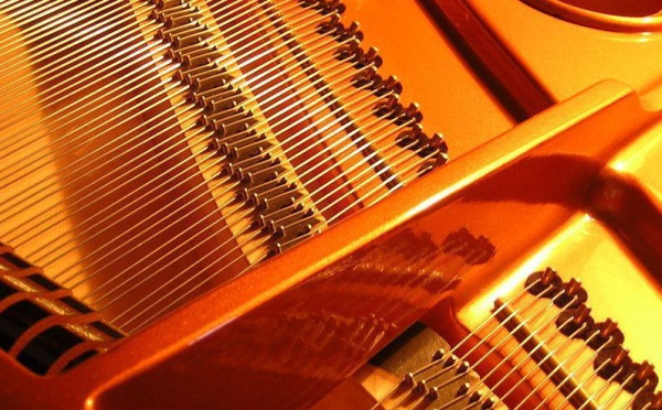 La table d’harmonie du piano à queue, sous les cordes. L'intérieur d'un piano à queue montrant le concept d'échelle duplex, de petits sillets situés...