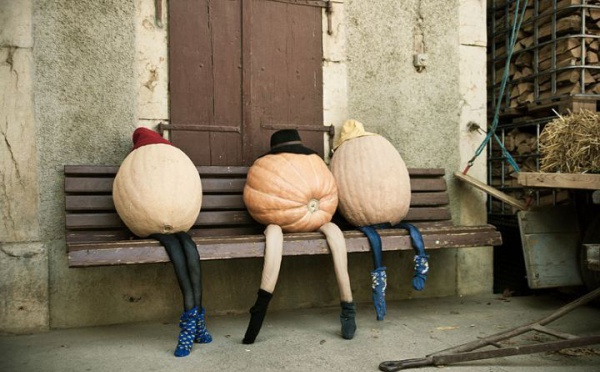Trois courges "assises" sur un banc Courges sur banc, dans la campagne vaudoise.