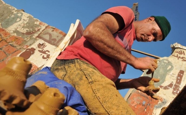 Profitant du soleil, cet homme travaille la terre à l’extérieur de son atelier pour fabriquer des têtes de narguilé en argile. Chanson ci-dessous...