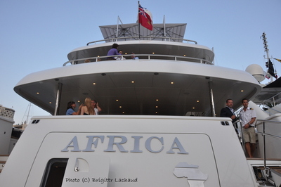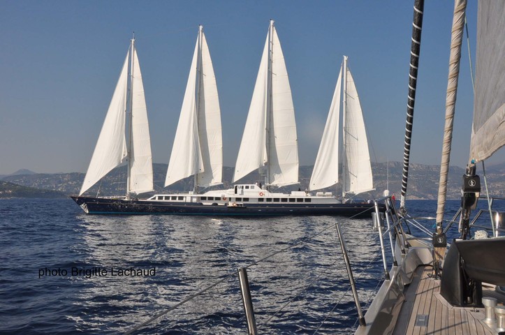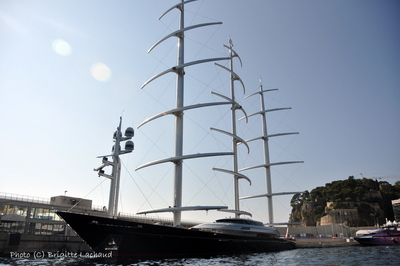 Puis le géant des mers Le Phocéa ancré dans la baie de Beaulieu, où nous embarquons dans une annexe pour nous conduire vers ce somptueux quatre mâts atteignant un immeuble de 15 étages équipé d'un système hydraulique unique pour actionner les voiles et dont nous avons admiré la ligne générale de l'un des plus grands yachts privés naviguant dans le monde pour une vitesse de 30 noeuds, splendide voilier de 78m dont l'élégance et la beauté n'ont d'égal..